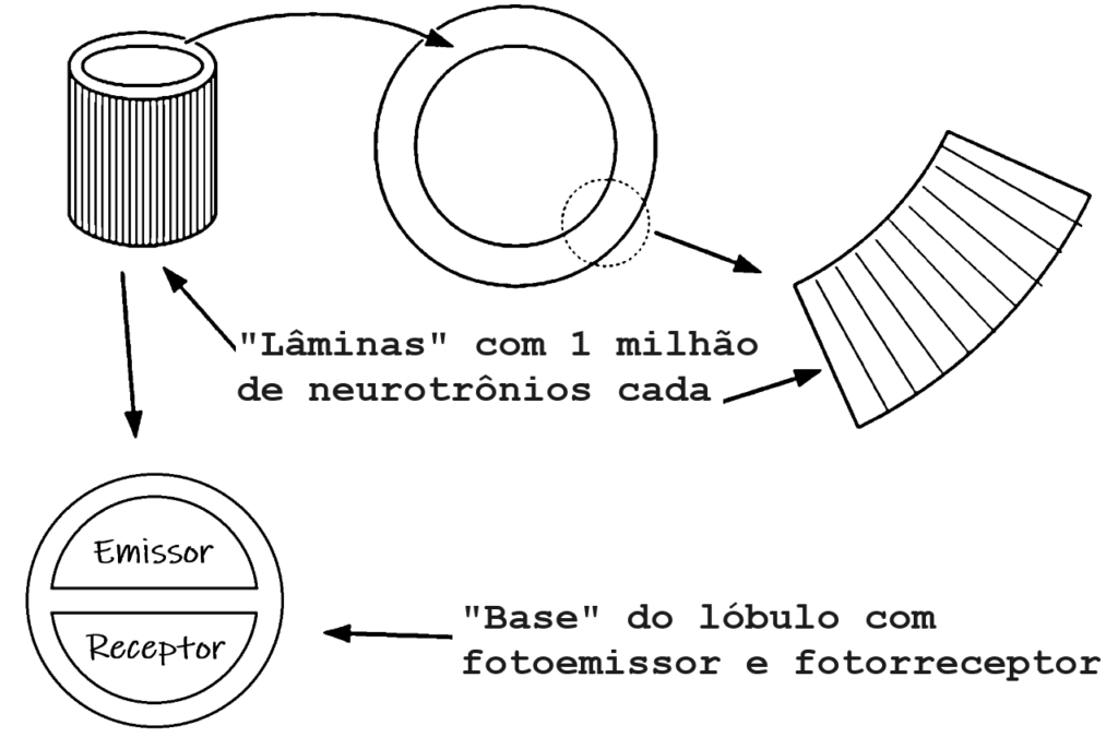 Cada lóbulo possui em sua base fotoemissores e fotorreceptores. O sinal de saída é multiplexado no fotoemissor e o de entrada é demultiplexado no fotorreceptor. A estrutura interna está ilustrada abaixo.